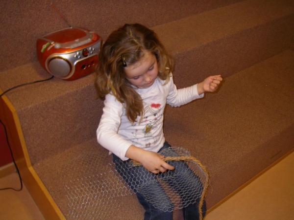 Nun haben wir uns an die Arbeit gemacht. Mit Draht mussten die Schuhteile aneinander genäht und mit einer Kordel umwickelt werden. Das war gar nicht so einfach, aber wir haben es dennoch geschafft.