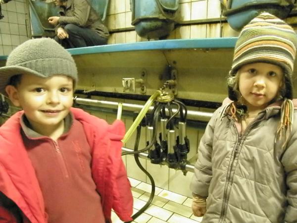 Hier sind wir im Melkstand. Alle Kühe müssen jeden Tag - auch Samstag und Sonntag - zweimal gemolken werden!