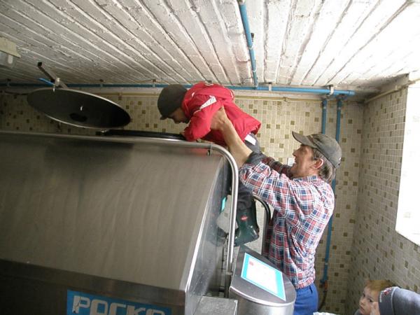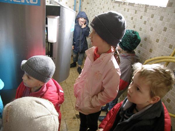 Wir schauen uns die Melkgeräte an und hören auch den Lärm der Pumpe! Wenn die Leitungen gespült werden, wird es richtig laut.