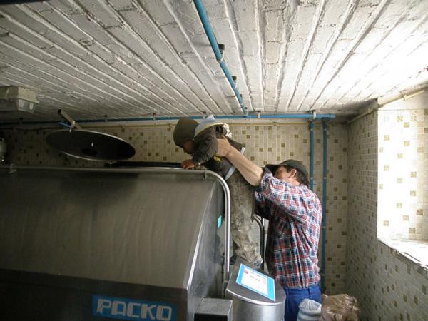 Wir folgen dem Rohr, durch das die Milch fließt und landen in der Milchkammer. Hier steht der Milchtank. Da ist aber viel Milch drin!