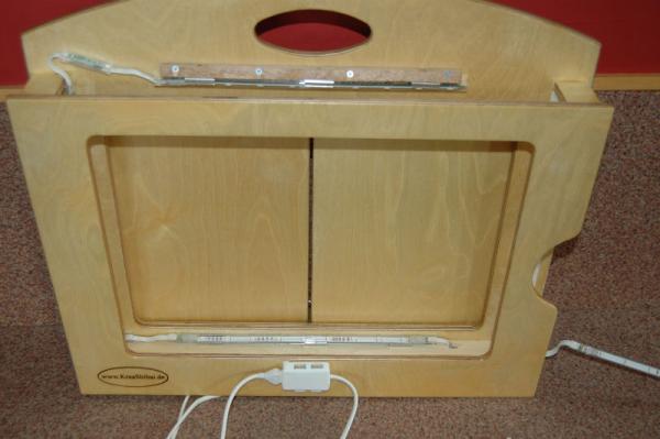 Ich habe mein KreaShibai mit Hilfe von meinem Vater noch etwas ausgearbeitet. Er hat mir 4 kleine LED Leisten eingebaut, die mit allen Zusatzteilen kombinierbar sind. Die LED Lampen lassen sich durch eine Fernbedienung steuern.