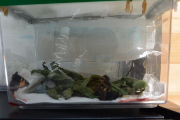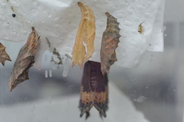 Nach drei Wochen bilden sie ein Kokon und nach 9 Tagen schlüpfen die ersten Schmetterlinge. Aus dem Kokon kommt auch ein Tropfen rote Flüssigkeit - das ist kein Blut- sondern nur die überschüssige Farbe, die der Schmetterling für seine Flügelfarbe braucht.