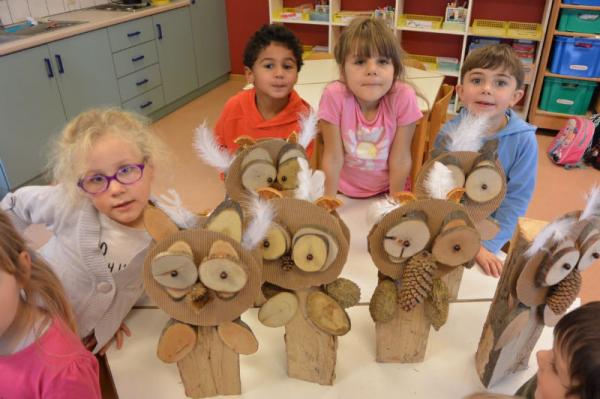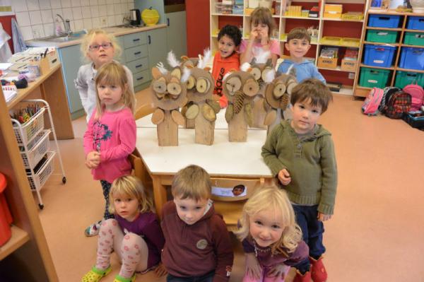 Mit Hammer, Nagel und Zange bauen wir lustige Kaminholz-Eulen.