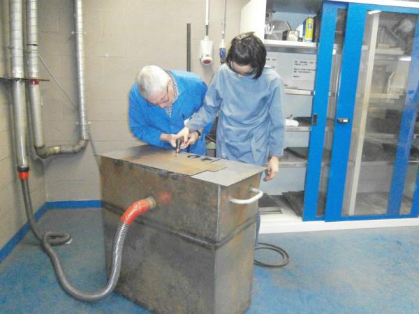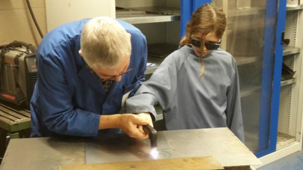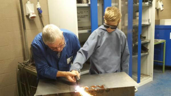 Gruppe 2 waren in dieser Zeit mit Fred in der Werkstatt. Dort haben wir einige Erklärungen zu den verschiedenen Schneidegeräte bekommen. Anschließend sind wir in die Schweißkammer gegangen um dort eine Form nach dem Plasmaverfahren auszuschneiden.