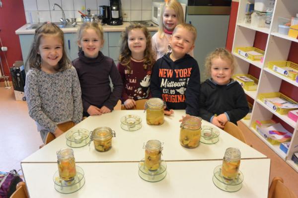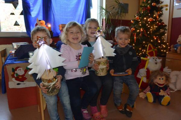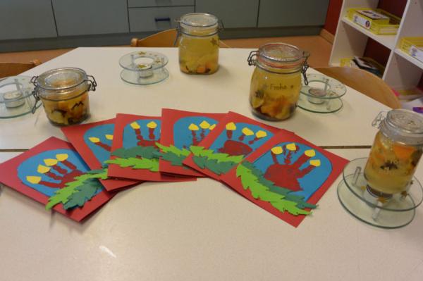 Die Kindergartenkinder basteln leuchtende Weihnachtsbäume aus Butterbrotpapier und einen Weihnachtsduft im Glas.