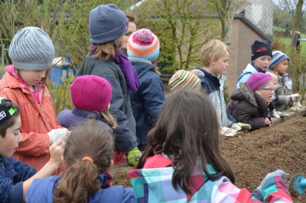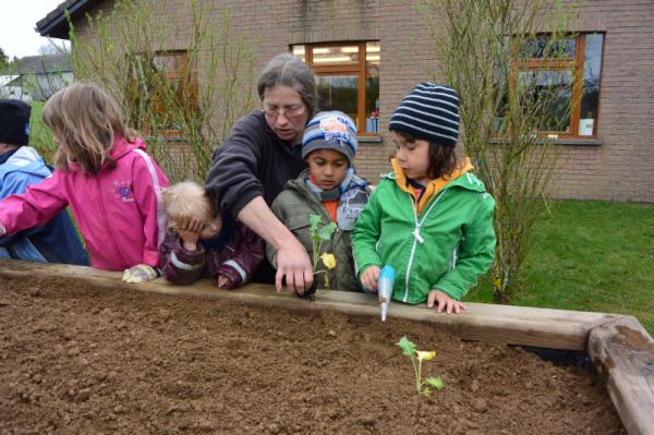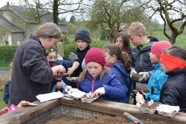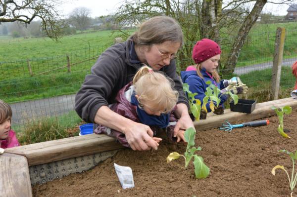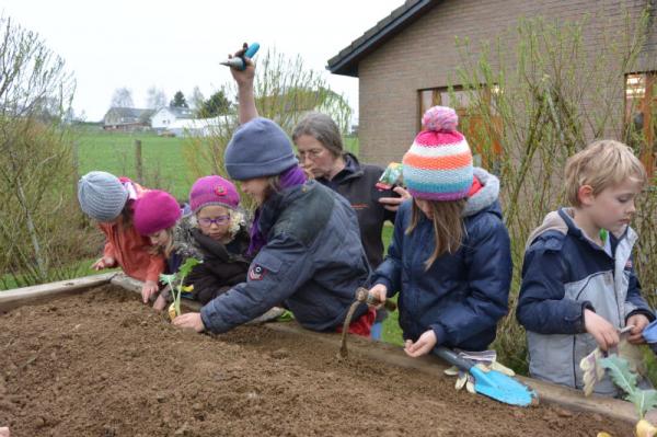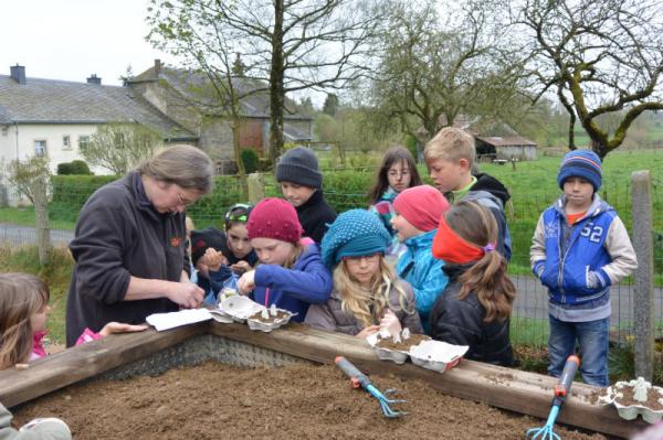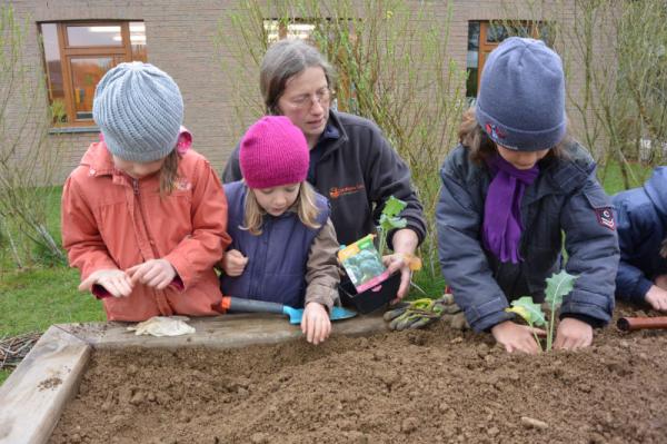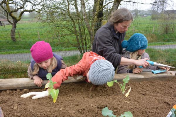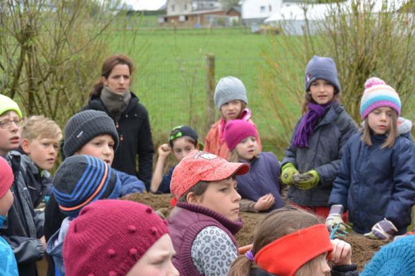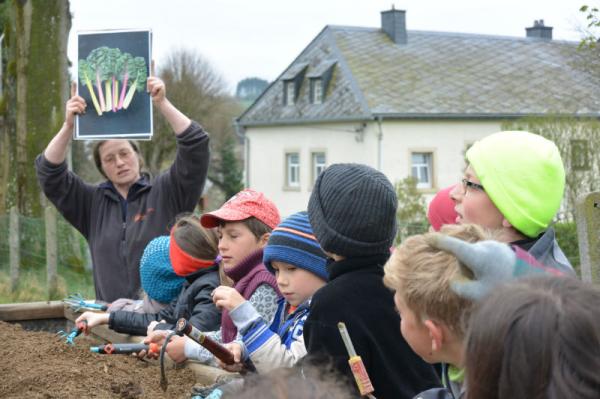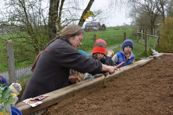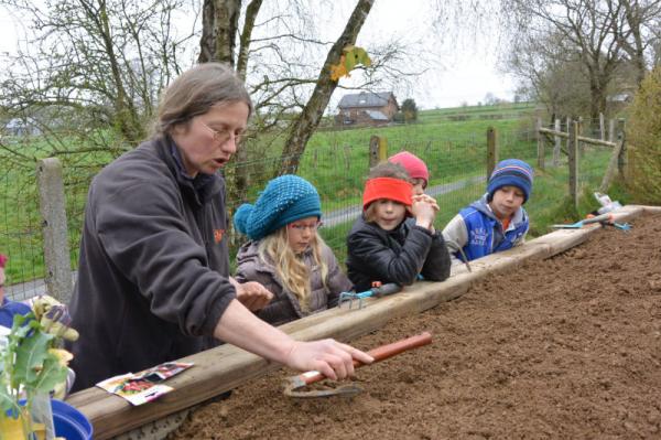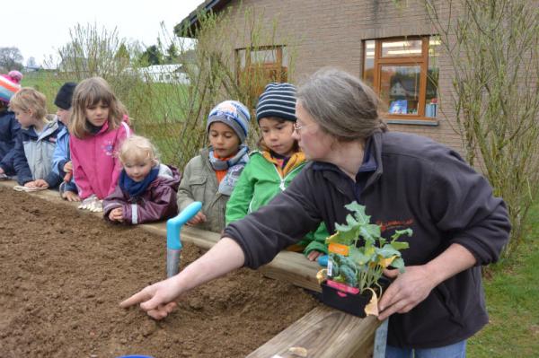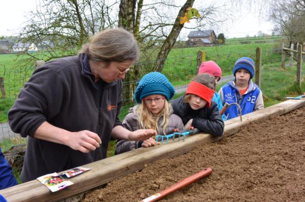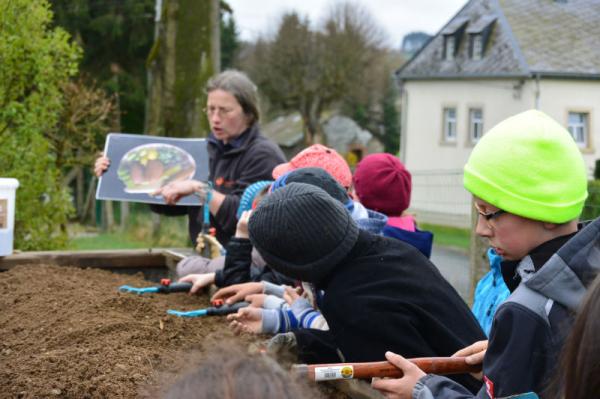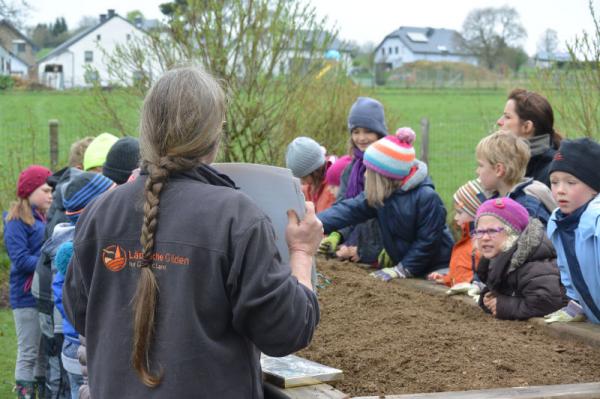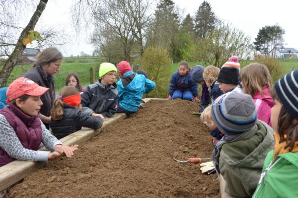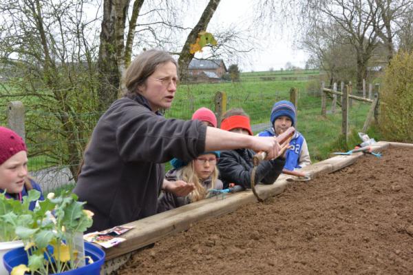Frau Fasch erklärt uns, was wir - an welcher Stelle- einpflanzen oder einsäen können.