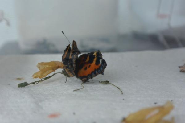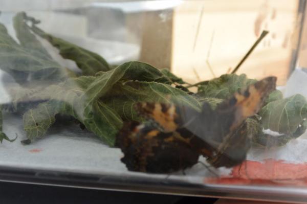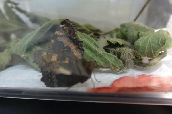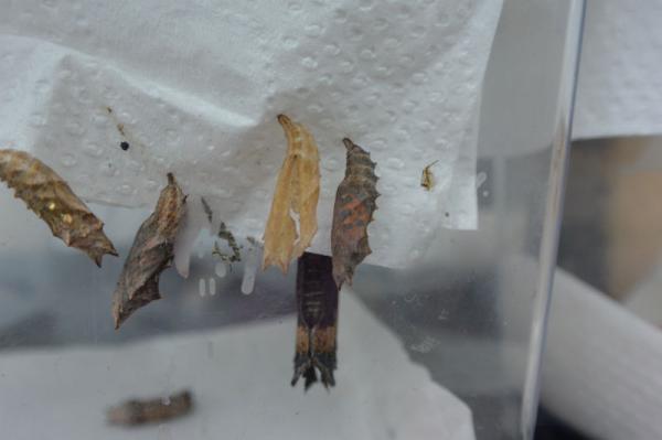 Nach drei Wochen bilden sie ein Kokon und nach 9 Tagen schlüpfen die ersten Schmetterlinge. Aus dem Kokon kommt auch ein Tropfen rote Flüssigkeit - das ist kein Blut- sondern nur die überschüssige Farbe, die der Schmetterling für seine Flügelfarbe braucht.