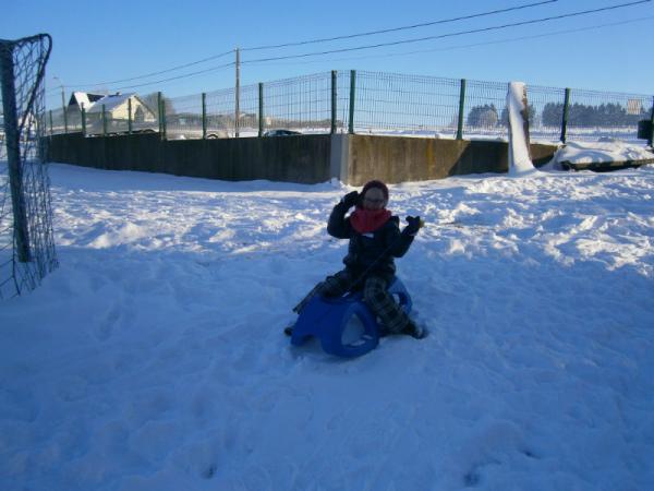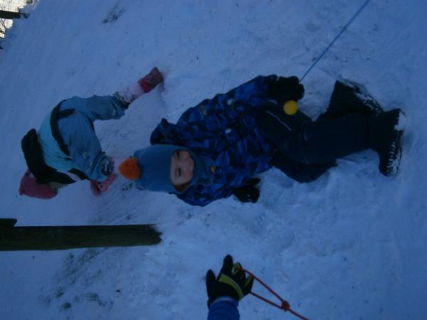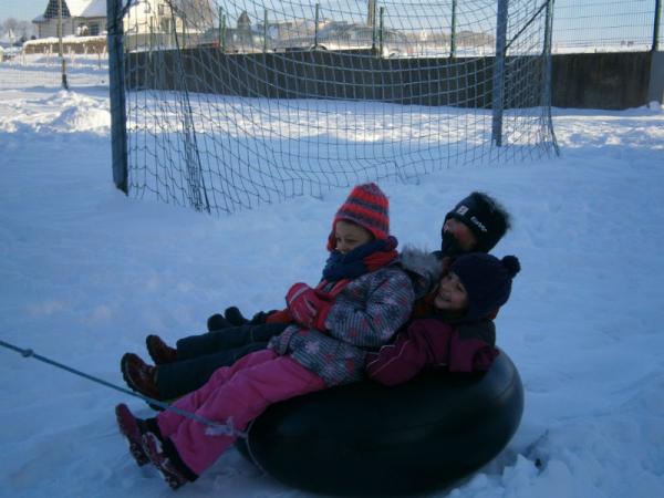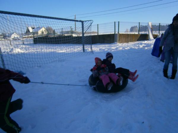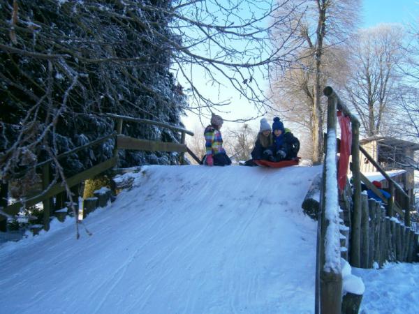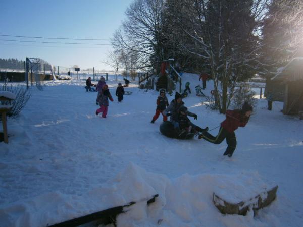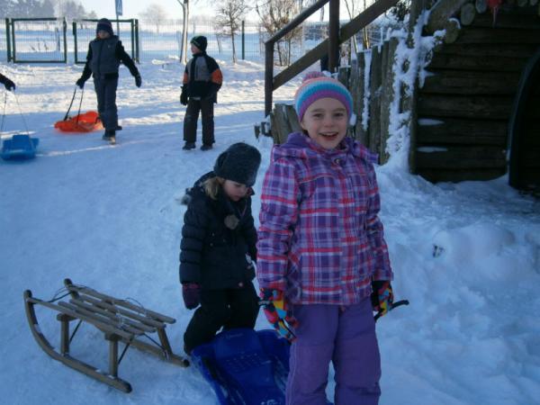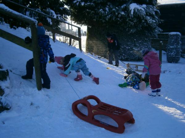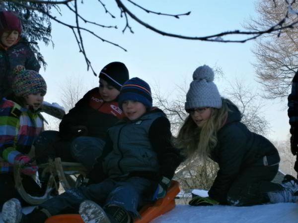 Der erste Schnee ist gefallen und die Kinder haben natürlich ihre Schlitten dabei.