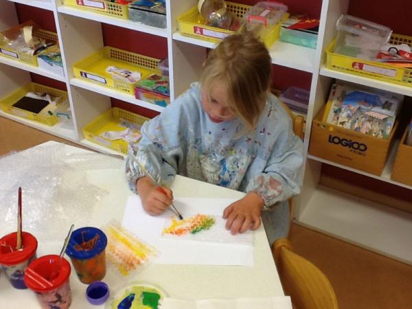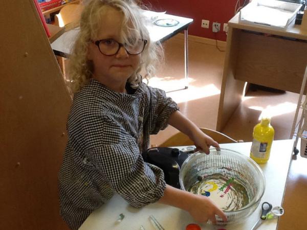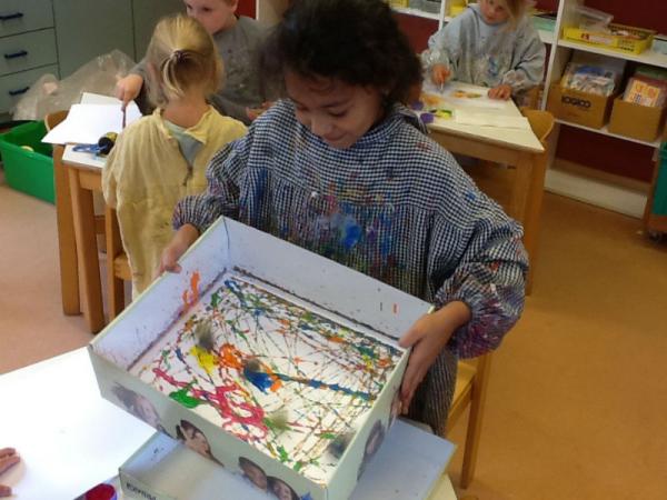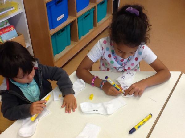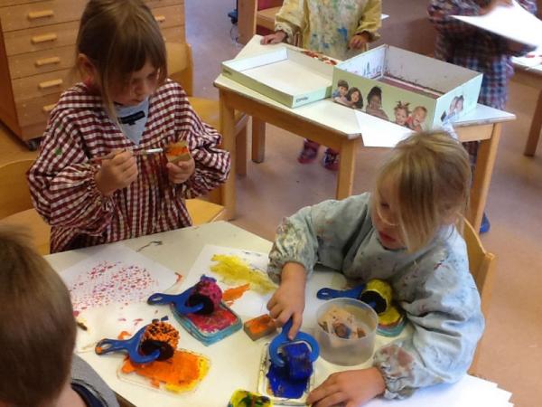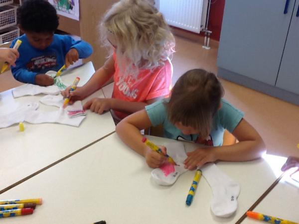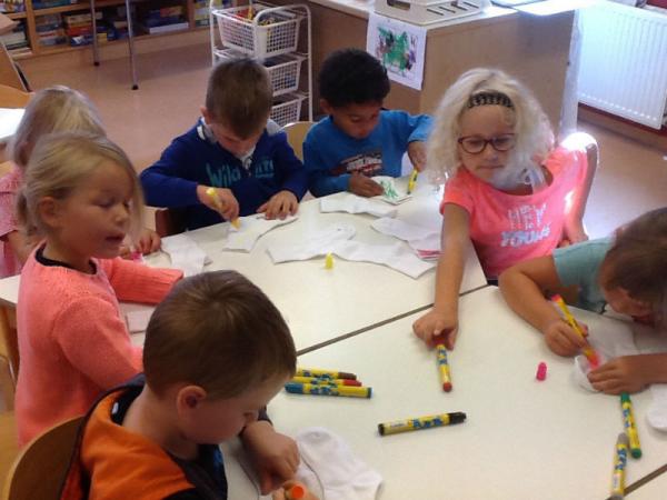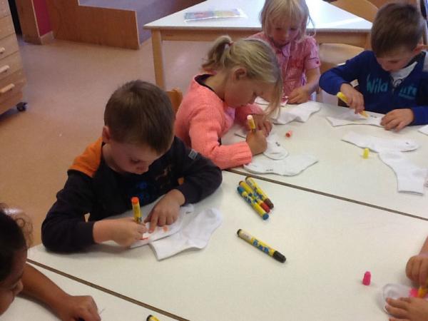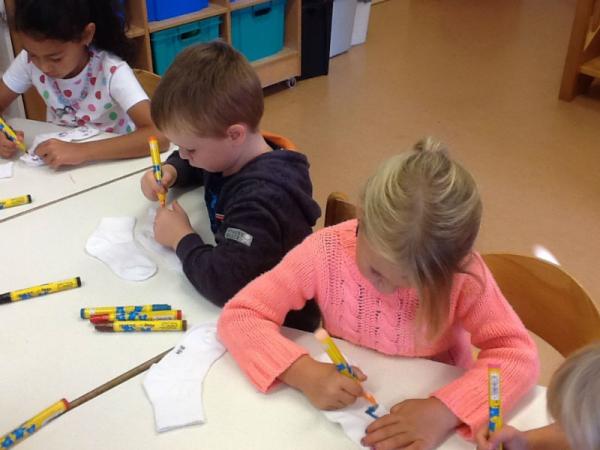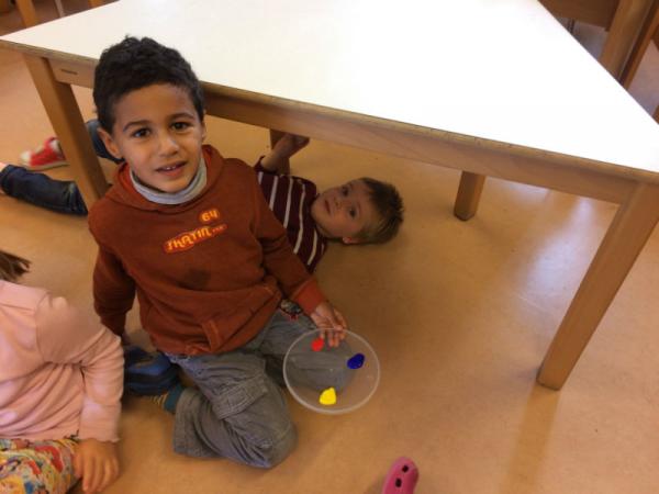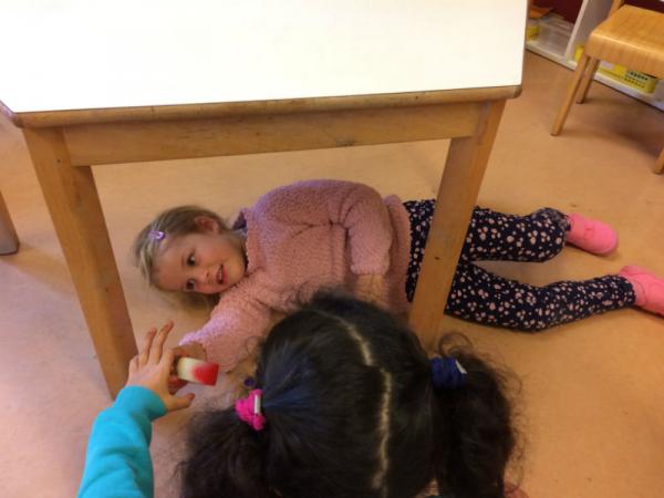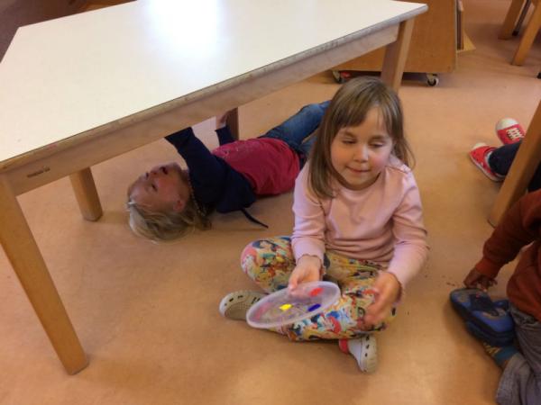 Frl. Sandra hat uns Zeichenblätter unter den Tisch geklebt, die wir aus einer neuen Perspektive anmalen können.