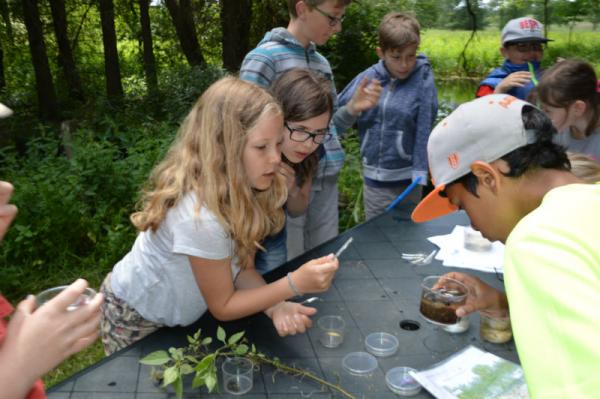 Am 12. Juni machten sich die Schüler des 3.-6. Schuljahres auf dem Weg zu einem naheliegenden Weiher um die unterschiedlichen Gewässer zu erforschen. Dabei untersuchten sie den Weiher, einen Tümpel, einen Bach, eine Quelle und einen Sumpf.