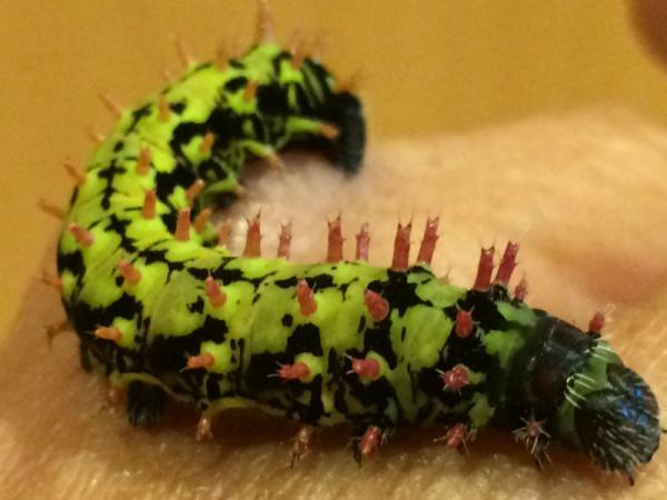 Die Raupen des Seidenspinners Antherina suraka (Madagaskar-Kaiser-Spinner) durchlaufen fünf verschiedene Stadien, in denen sie ihre Farbe von schwarz, rot, gelb über Rot-Gelb ändern.