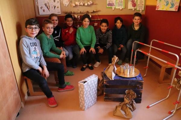 Im Anschluss packten wir dann unsere Geschenke aus. Jedes Kind erhielt eine Tüte mit leckeren Sachen und für die Klasse erhielt jedes Schuljahr pro Kind ein Buch für unsere Schullektüre sowie ein Hürdenset.