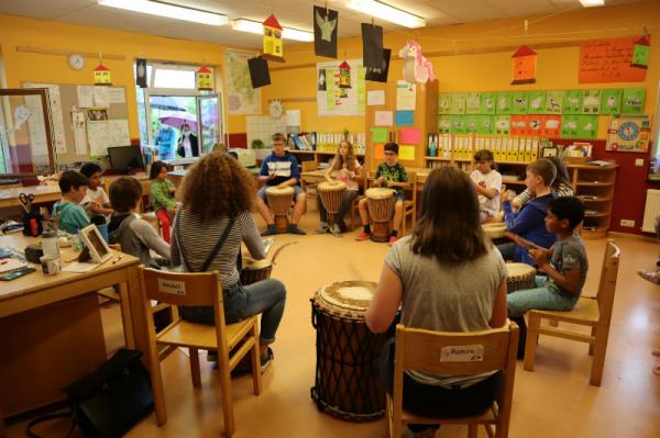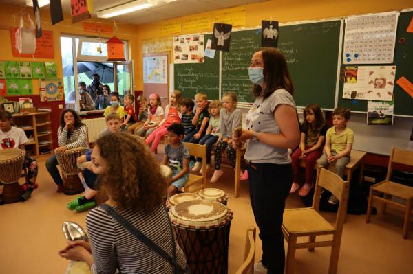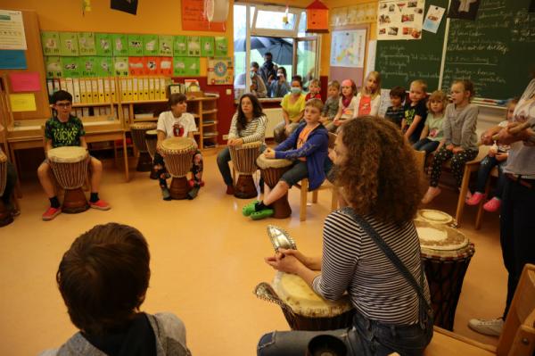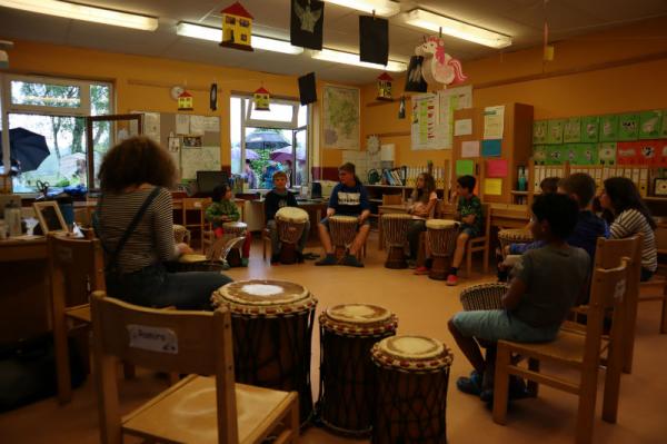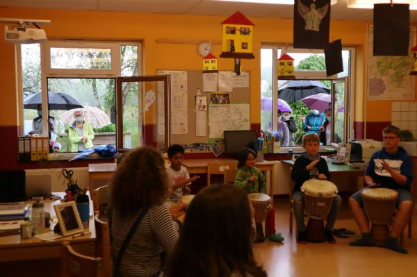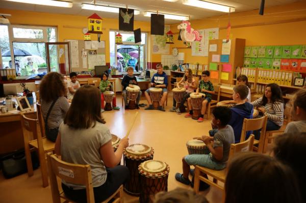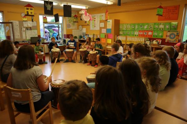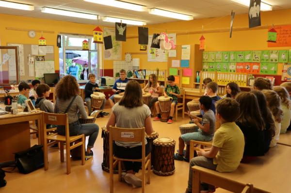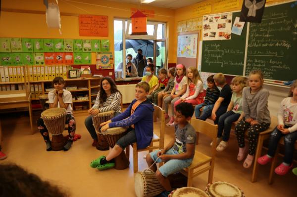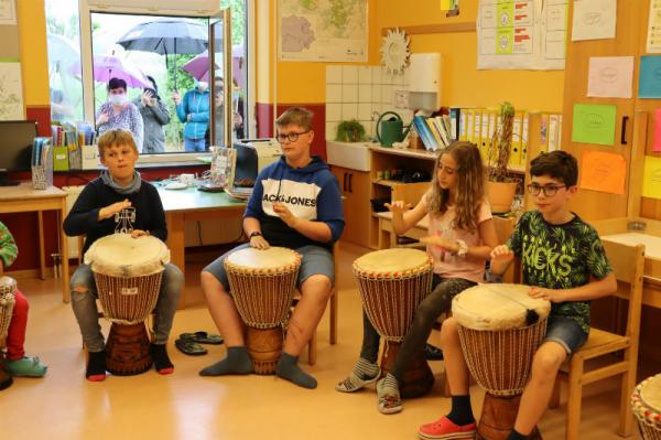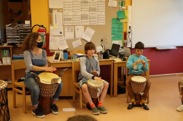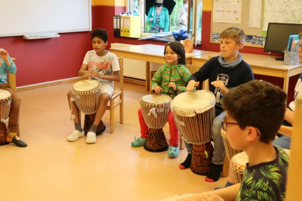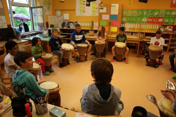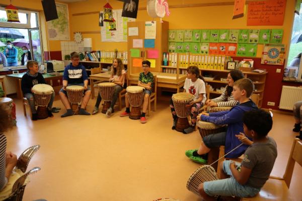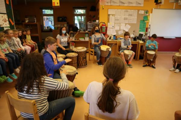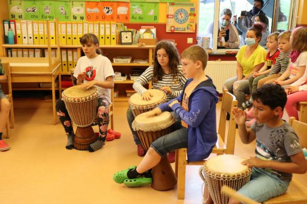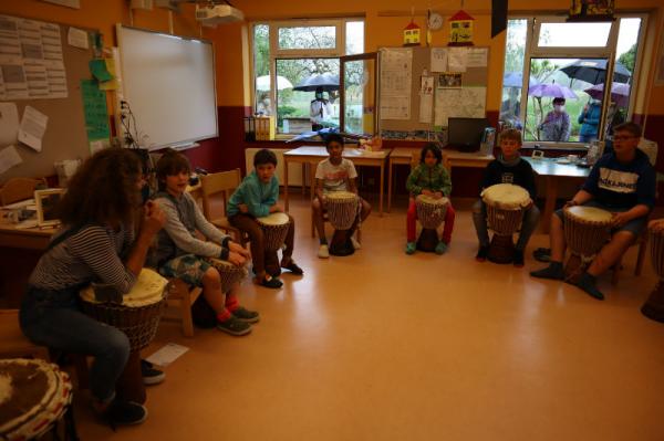 Im Rahmen des Musikunterrichtes spielte Frl. Patricia mit uns Djembé. An einigen Nachmittagen während des Schuljahres übte sie mit uns einige Sequenzen ein und somit konnten wir letzte Woche den Eltern eine kleines Djembé-Konzert darbieten.