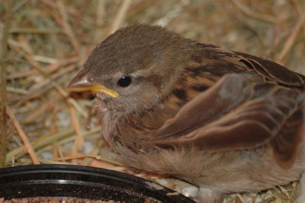 Schnell wurde aus dem Vogelbaby ein kleiner Spatz, der nach 2 Wochen schon durch Frl. Sandras Keller flog.